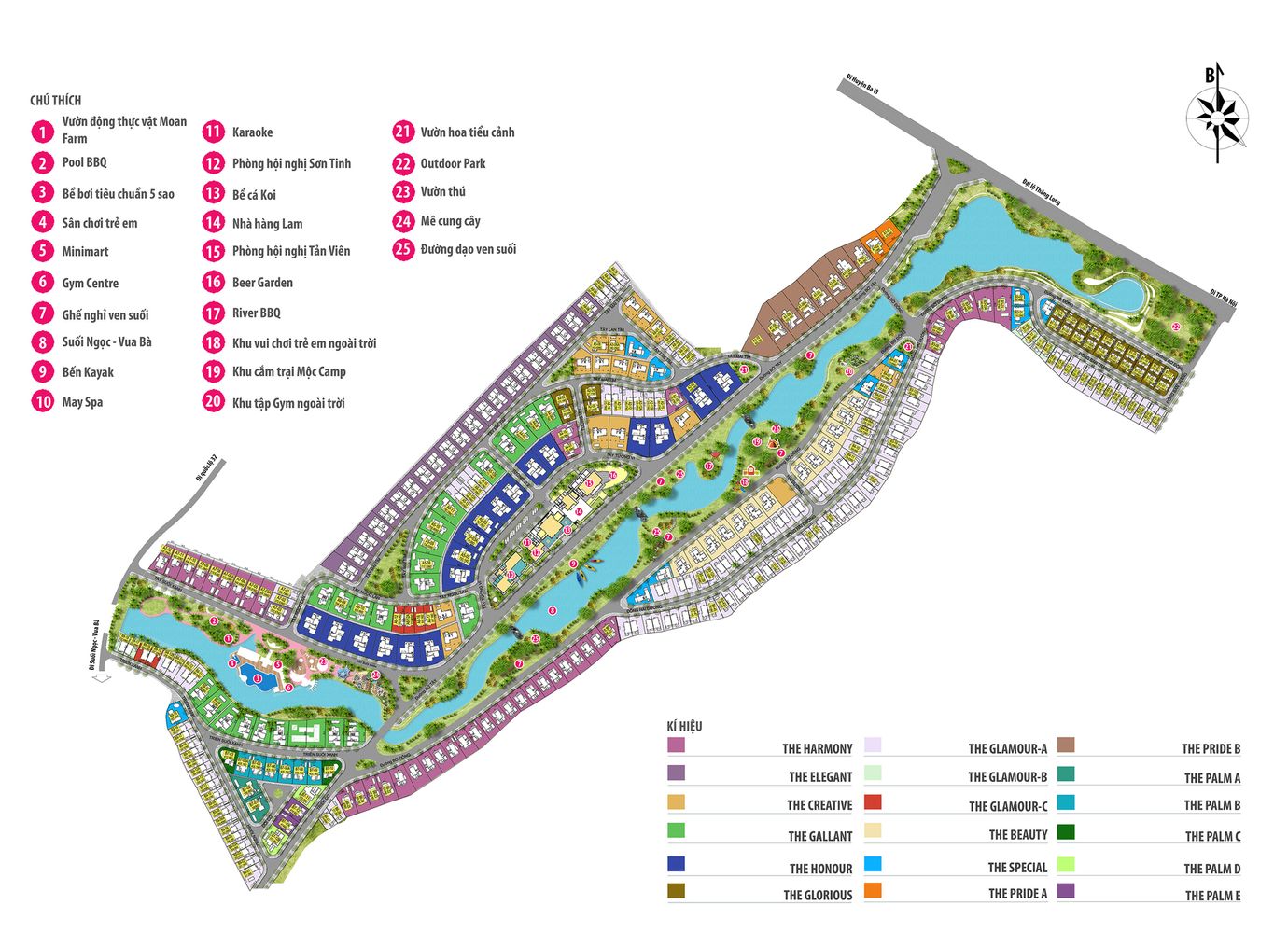 - Quy mô: Gồm 3 khu A, B, C diện tích 50 ha. Gồm 500 căn biệt thự, mật độ xây dựng 46%.