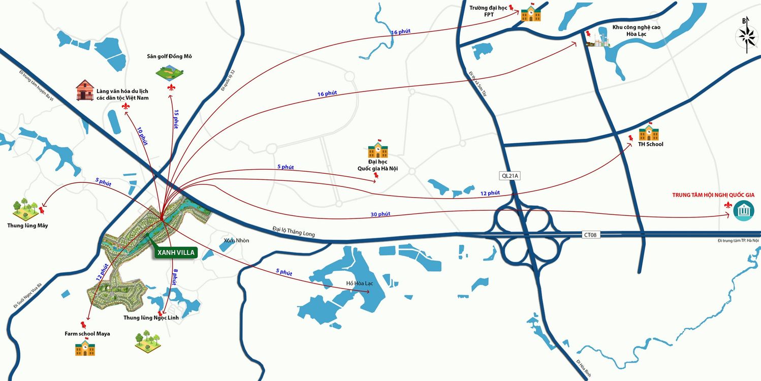 - Đi dọc theo đường đại lộ Thăng Long, nằm gần khu công nghệ cao hoà lạc